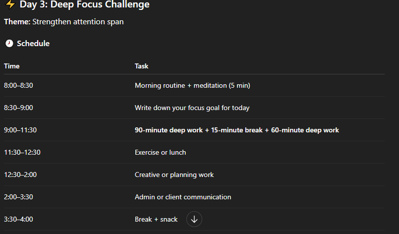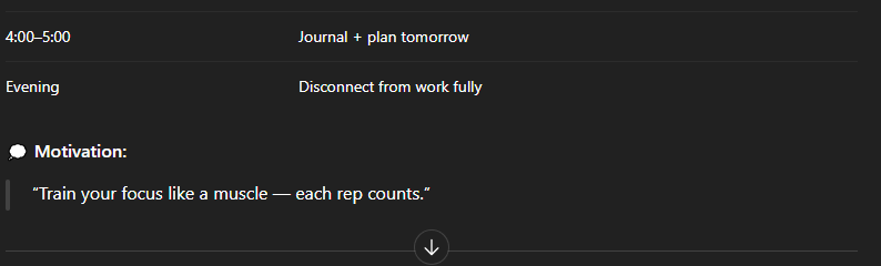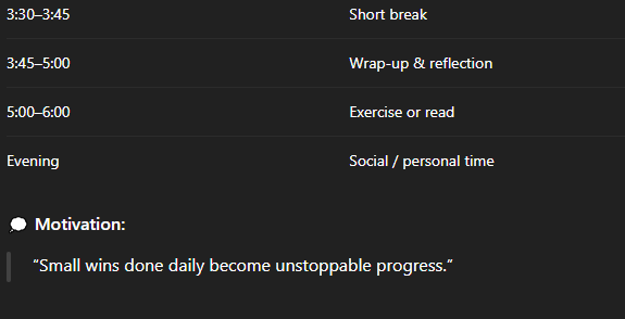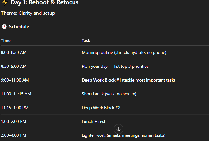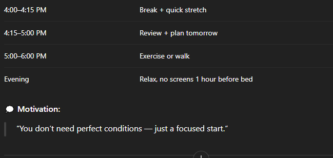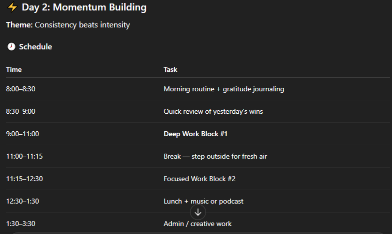 Boom 💥 — a fully organized 5-day schedule, including morning focus blocks, creative bursts, lunch breaks, evening wind-down tips, and even motivational reminders like: