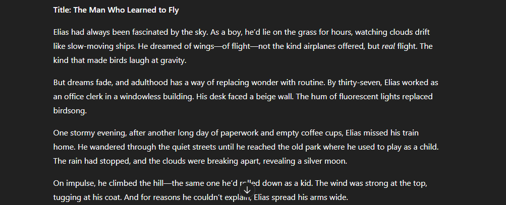 This time, the result was stunning — vivid descriptions, emotional dialogue, and a powerful hook. It even used film-like pacing and sensory language.