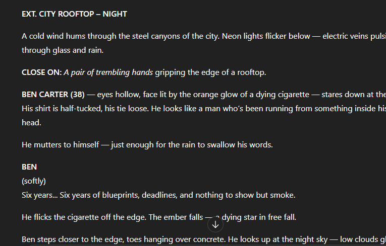 “Act as a screenplay writer. Write the opening scene of a short film where a burned-out engineer discovers he can fly — but every time he does, he loses a memory. Make it emotional, cinematic, and end on a cliffhanger.”