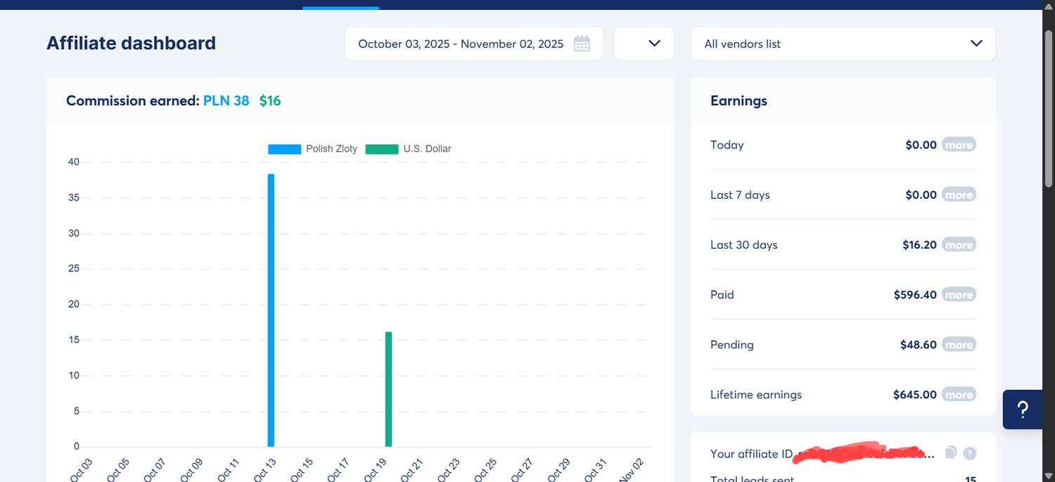 This is how your affiliate dashboard looks after earning commissions; yours will be blank if you just signed up.