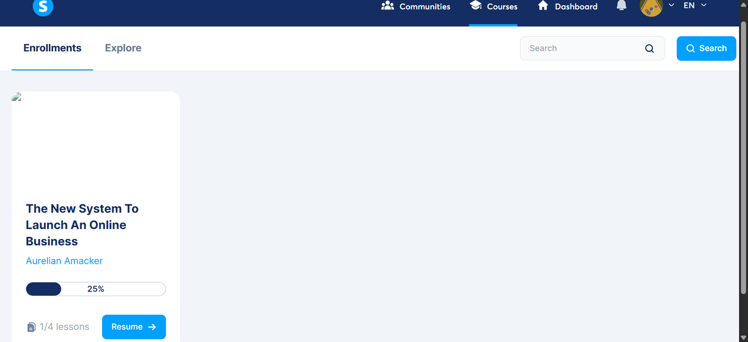 The Student Dashboard is designed for users who sell online courses or membership content through Systeme.io. It’s where you can access all the courses you’ve purchased or created.