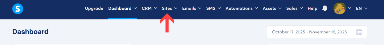 The Sites tab is where you build and manage the front-facing parts of your business — your pages, funnels, blogs, and membership/course areas. Everything related to website creation, landing pages, and content delivery lives here.